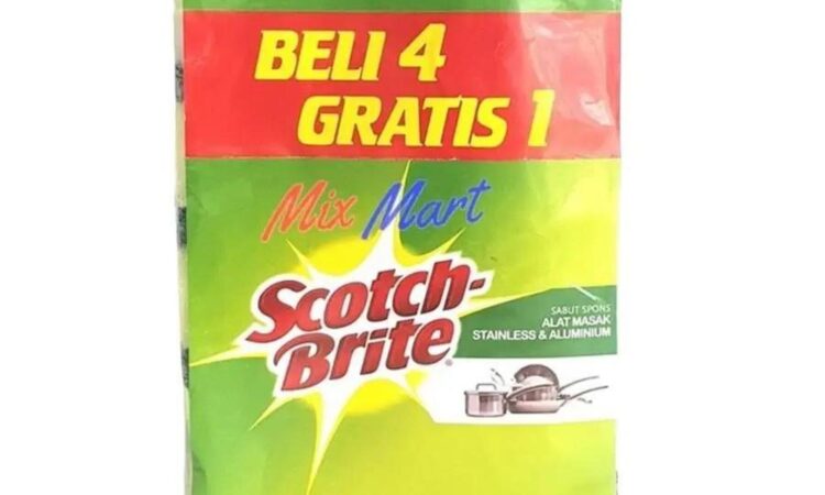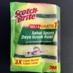 | Nama Produk : 3M Scotch-Brite Sabut Hijau Spon Kuning | 1. Desain Unik Dua Sisi : Sisi hijau dari sabut kasar (scouring pad) untuk menggosok kerak membandel pada alat masak. Sisi kuning dari spons lembut untuk menyerap busa dan membersihkan permukaan yang sensitif tanpa menggores. |