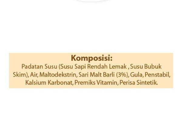 Padatan susu rendah lemak, maltodekstrin, sari malt barli (3%), premiks vitamin, dan mineral.