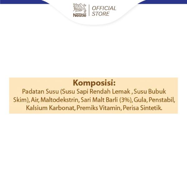 Padatan susu rendah lemak, maltodekstrin, sari malt barli (3%), premiks vitamin, dan mineral.