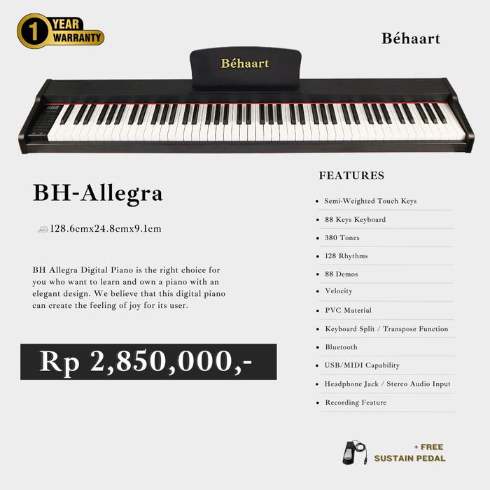 | Cara Pairing Bluetooth | Aktif otomatis saat piano dinyalakan. Password akan diberikan setelah pembelian. |