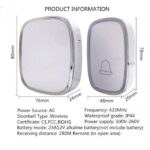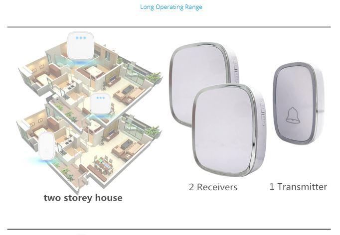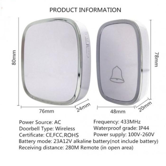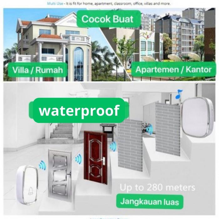 Nikmati 36 pilihan ringtone yang melengking dan jelas, disesuaikan dengan tingkat volume yang diinginkan melalui 4 level pengaturan. Tombellnya memiliki rating IP44 sehingga tahan terhadap percikan air dan hujan, cocok untuk pemasangan outdoor. Jangkauan sinyalnya mencapai 300 meter (dalam kondisi tanpa penghalang). Pemasangannya sangat mudah, tanpa perlu repot instalasi kabel karena sistemnya wireless. Receiver menggunakan listrik AC dengan colokan versi Indonesia.