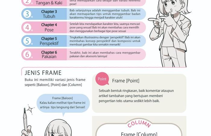 | Bab Pembelajaran | Wajah, Tangan & Kaki, Tubuh, Pose, Perspektif, Pakaian |