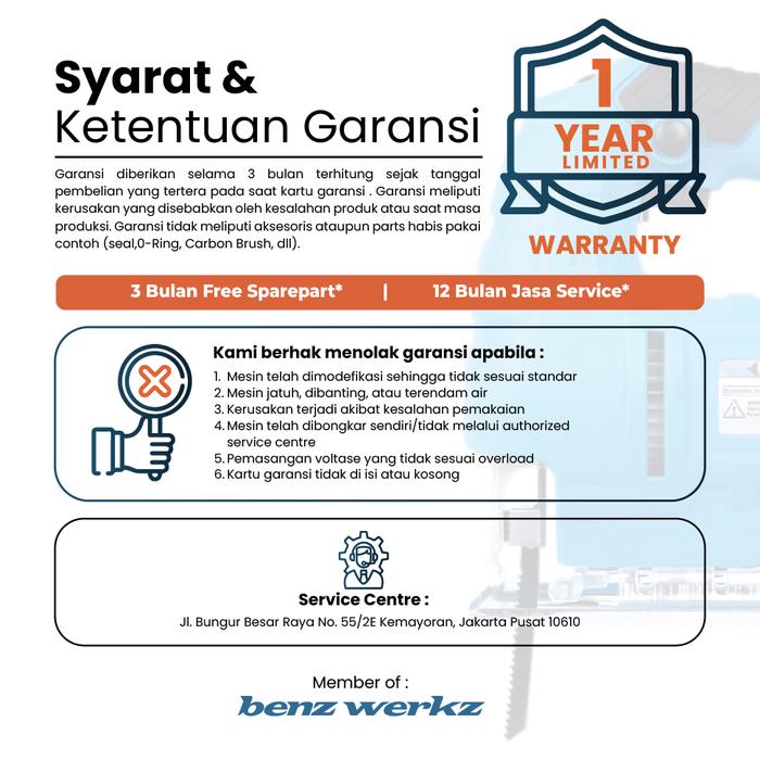Setiap pembelian mendapatkan paket lengkap: 1 unit mesin, 2 bilah mata gergaji standar, 1 kunci L, buku petunjuk, dan kartu garansi. Dukung hasil kerjamu dengan alat yang reliable dan didukung garansi resmi 1 tahun.