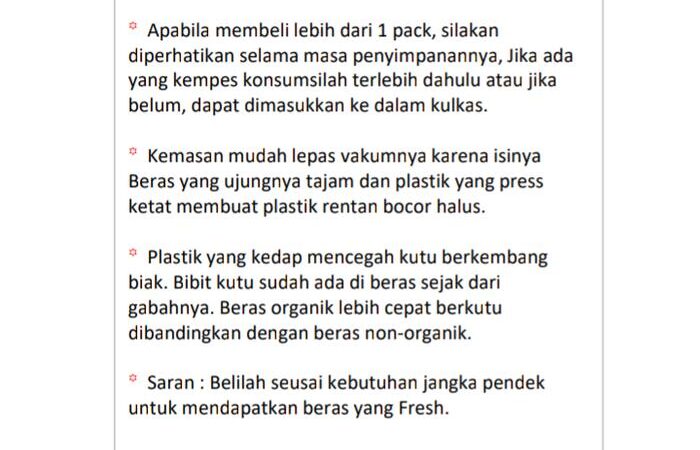 Beras organik harus disimpan dalam kemasan kedap udara atau kulkas untuk menjaga kesegaran.