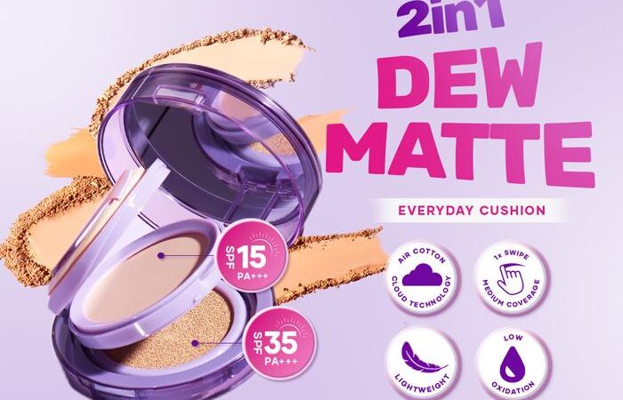 | 2in1 Dew Matte Cushion | 1 | 2-in-1 cushion (dewy) + padat (matte), Dual SPF (SPF 35 & 15), Coverage buildable, Air Cloud-Cotton Technology, Cocok untuk kulit berjerawat. | Pilih 1 dari 11 shade: Pearl, Vanilla, Almond, Honey, Cinnamon, Creme, Butter, Cookie, Shell, Biscotti, Hazelnut |