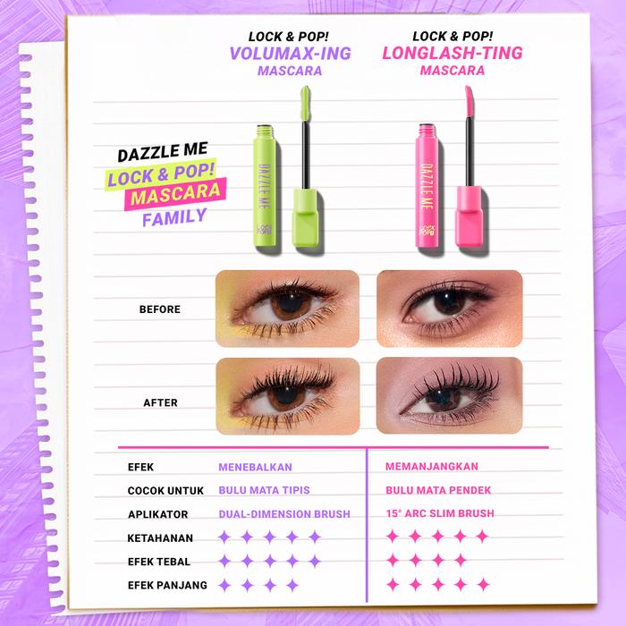 Temukan keajaiban bulu mata dengan Dazzle Me Lock & Pop! Duo Mascara Series. Pilih favoritmu: VoluMAX-ing Mascara untuk volume maksimal atau LongLASH-ting Mascara untuk bulu mata lentik dan panjang!