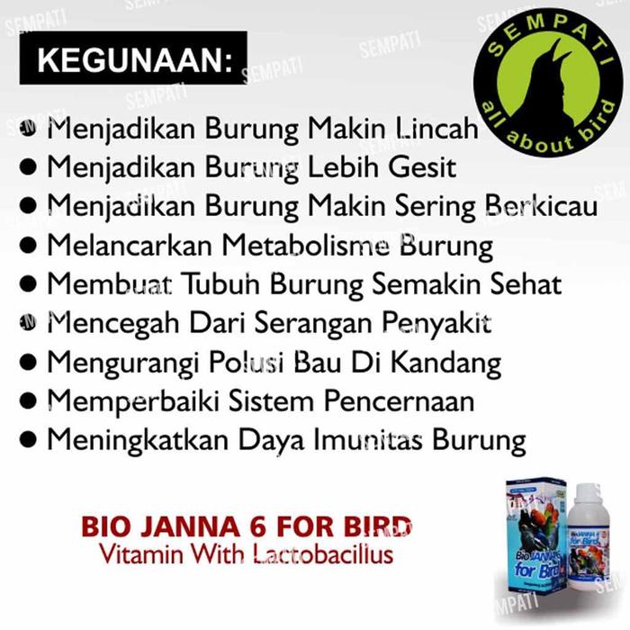 Garansi Kepuasan: Buktikan sendiri kualitas Biojanna 6 untuk burung kesayangan Anda! Pesan sekarang dan rasakan perbedaannya.