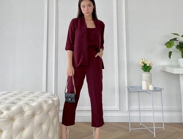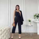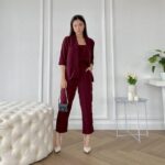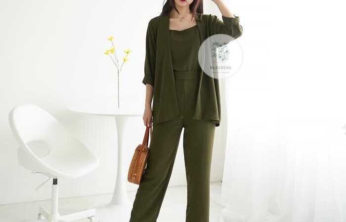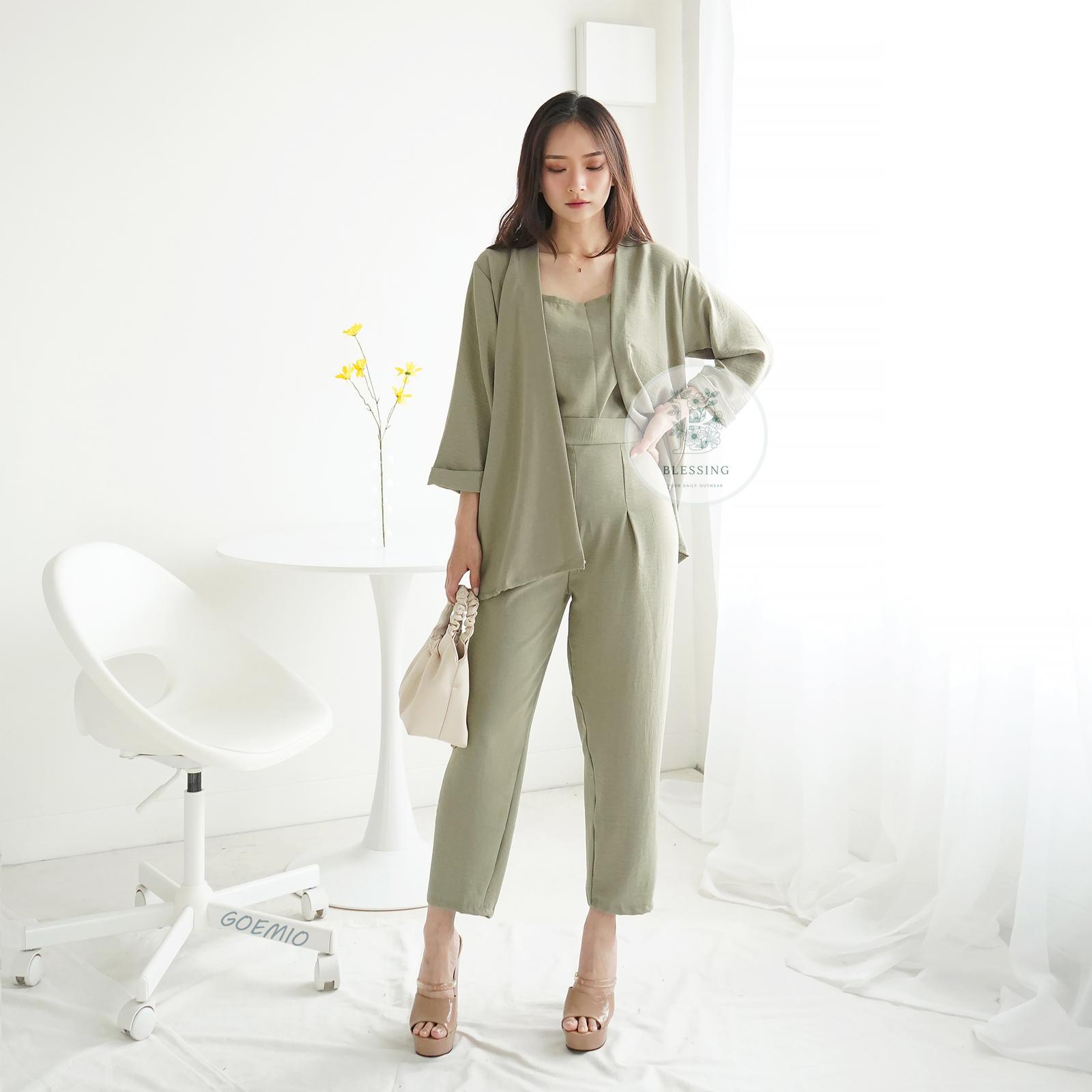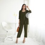 | Desain | Blazer atasan simple dengan lengan 3/4 dan celana panjang yang flowy. |