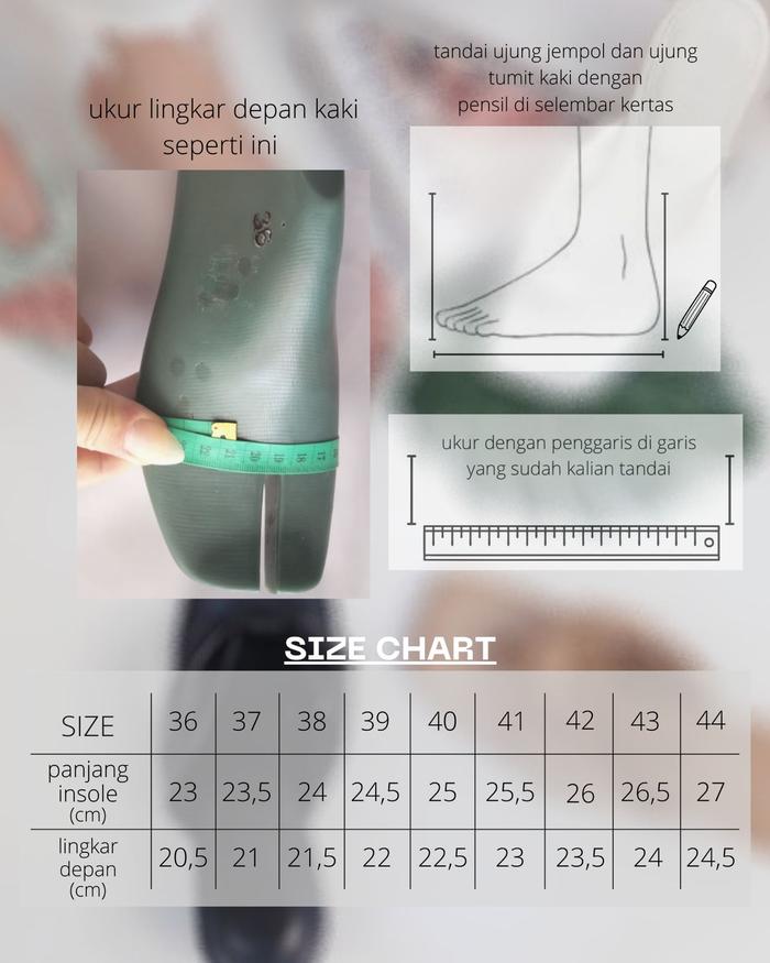 Penting: Model ini disarankan untuk naik 1 ukuran dari ukuran biasa Anda. Ukuran di atas adalah estimasi. Untuk hasil terbaik, ukur panjang kaki (dalam cm) sebelum memesan. Jika kaki Anda termasuk lebar atau gemuk, sangat disarankan untuk memilih ukuran yang lebih besar. Konsultasikan dengan admin kami untuk bantuan memilih ukuran yang tepat.