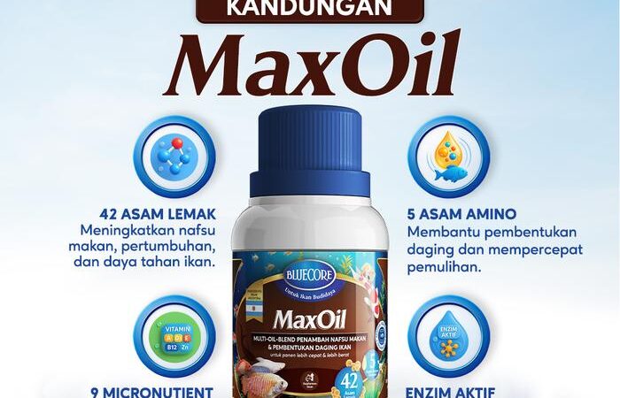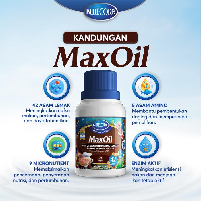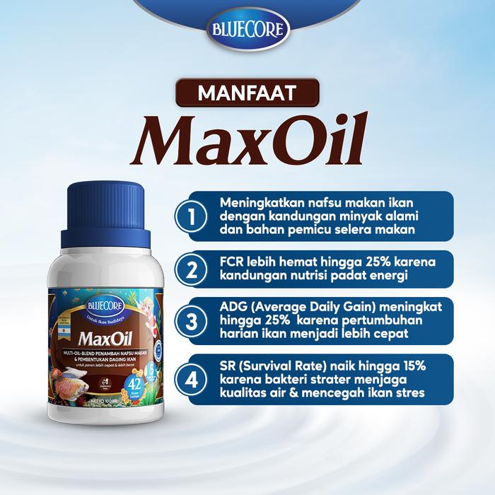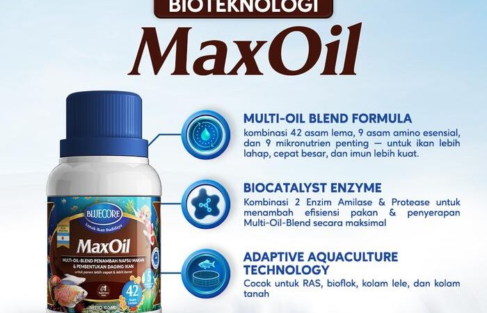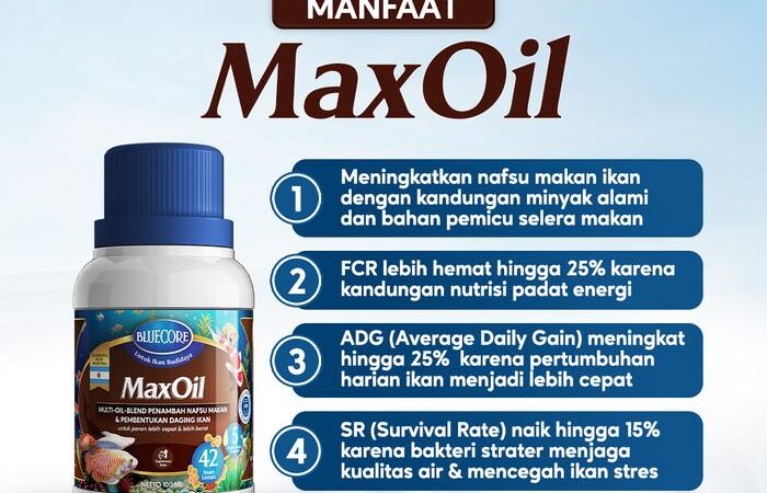 Tingkatkan produktivitas budidaya ikan Anda dengan BlueCore MaxOil, suplemen vitamin berbasis Essential Oil dan Omega 3-6 yang diformulasikan khusus untuk ikan konsumsi. Formula ini tidak hanya merangsang nafsu makan tetapi juga mempercepat pertumbuhan bobot dan pembentukan daging, menghasilkan ikan yang lebih sehat, segar, dan padat. Cocok untuk semua jenis ikan seperti Gurame, Lele, Nila, dan Patin pada segala skala budidaya.