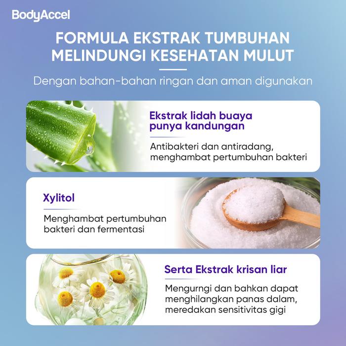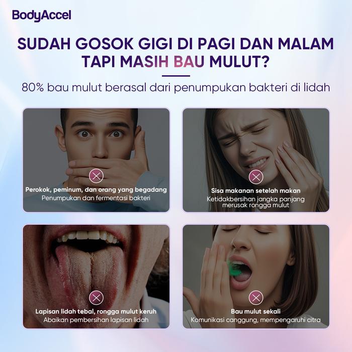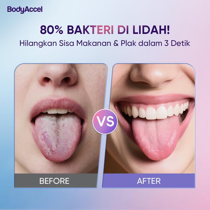 Tuntaskan masalah lidah tebal dan bau mulut yang memalukan dengan Bodyaccel. Dibuat dengan formulasi khusus yang telah terdaftar BPOM, produk ini tidak hanya membersihkan tetapi juga memutihkan dan menyegarkan napas secara instan. Dirancang untuk segala usia, Bodyaccel menjawab semua kelemahan metode pembersihan lidah biasa.