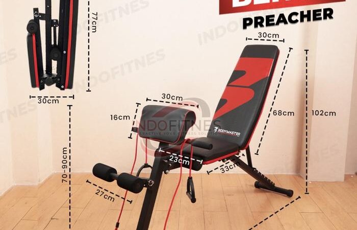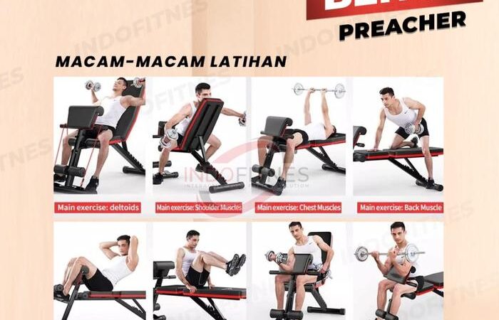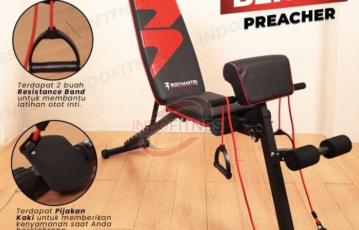 - Preacher board: Papan sandaran khusus untuk melatih otot bicep dengan postur stabil.