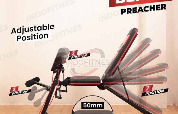 - Preacher board (7 posisi) optimal untuk bicep/arm workout.