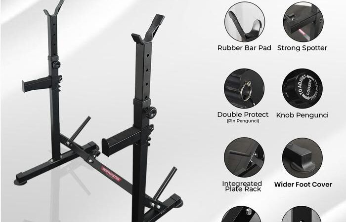 - Squat Rack: Peralatan gym berupa struktur penyangga untuk menempatkan dan menyangga barbel, memungkinkan pengguna untuk melakukan angkatan berat seperti squat dan overhead press dengan aman. Berbeda dengan Power Rack yang berbentuk sangkar (cage) tertutup, squat stand biasanya berupa dua tiang penyangga yang berdiri bebas (alatfitnespremium.com).
