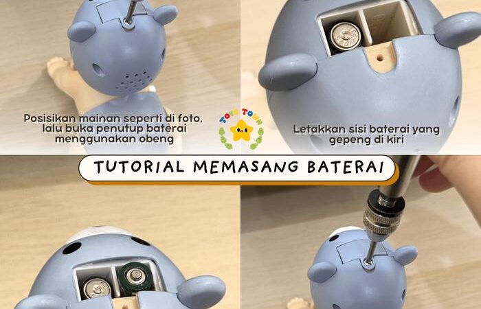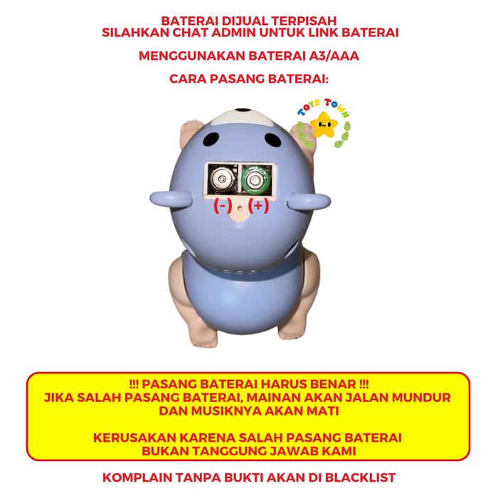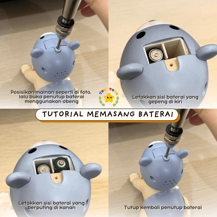 Pastikan polaritas baterai (+/-) dipasang dengan benar. Kesalahan pemasangan akan menyebabkan mainan berjalan mundur dan musik tidak dapat menyala.