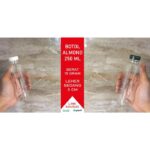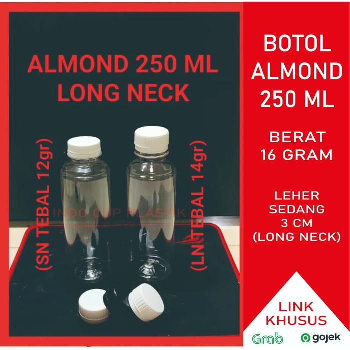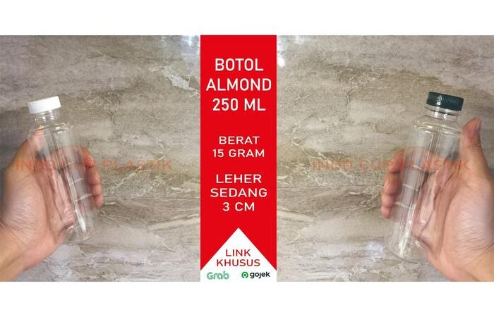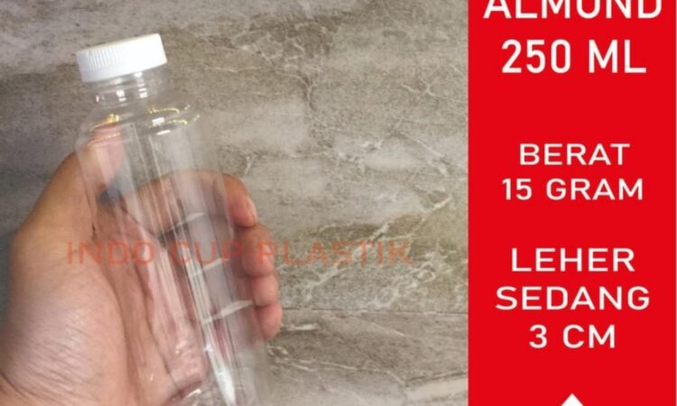 Tersedia botol almond plastik short neck dengan material PET Food Grade yang aman untuk kemasan makanan dan minuman. Kapasitas 250 ml cocok untuk produk susu, sari almond, minuman kekinian, madu, atau kebutuhan packaging lainnya. Dimensi botol: diameter 5 cm, tinggi 15 cm, dengan ketebalan dinding 3/5 untuk menjamin kekuatan dan ketahanan.