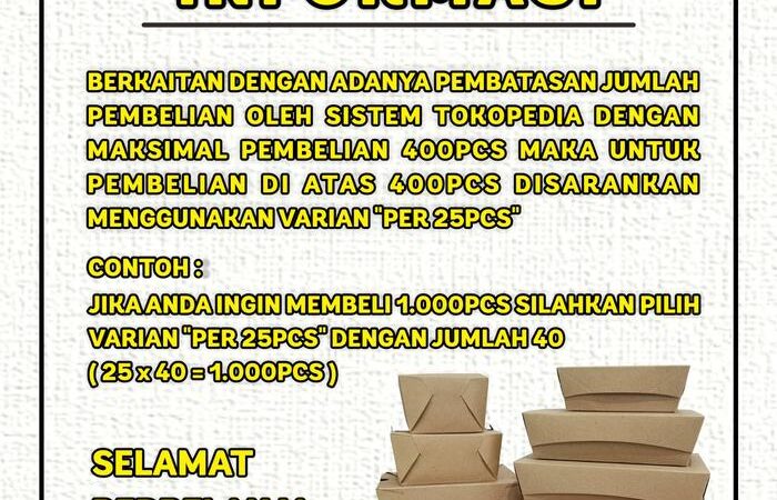 Karena sistem Tokopedia membatasi pembelian maksimal 400 pcs per transaksi, untuk pemesanan besar (contoh: 1.000 pcs) pilih varian “Per 25 pcs” dan masukkan jumlah 40 (25 x 40 = 1.000 pcs).