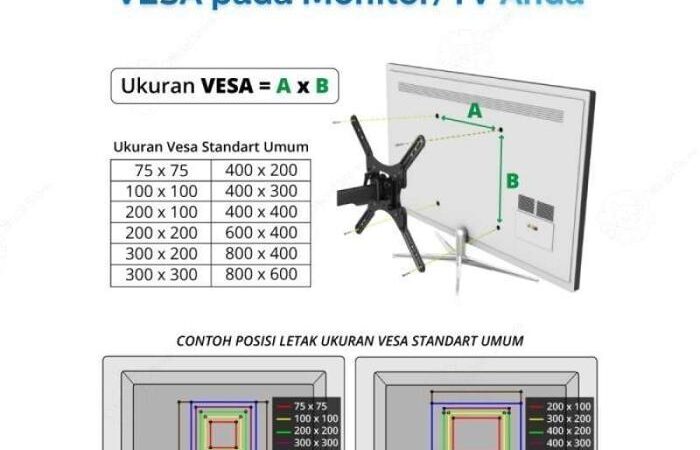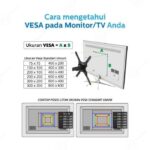 - VESA: Standar pola lubang pada bagian belakang TV atau monitor untuk pemasangan bracket. Diukur dalam milimeter (misal 200×200 artinya jarak vertikal dan horizontal antar lubang adalah 200mm).