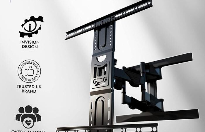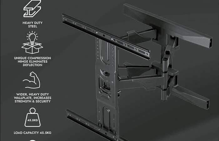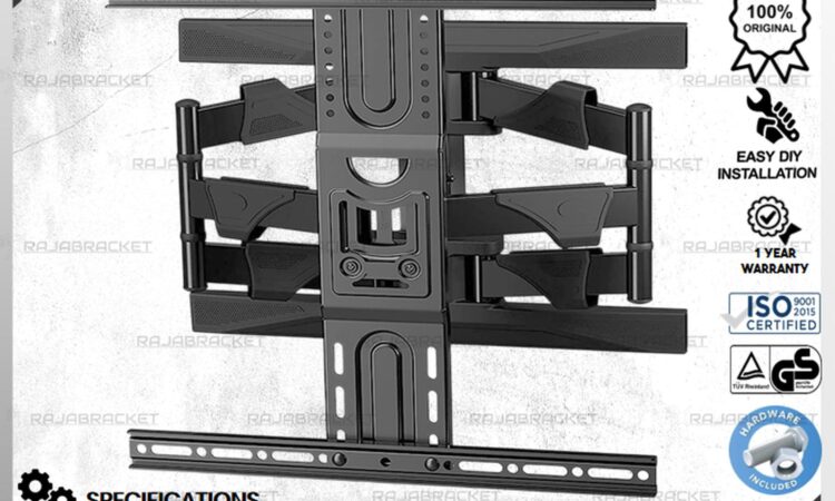 - Full Motion Cantilever Mount: Jenis bracket TV yang memiliki lengan menjorok (cantilever) dan memungkinkan berbagai gerakan seperti memutar, memiringkan, menarik, dan mendorong TV setelah terpasang.