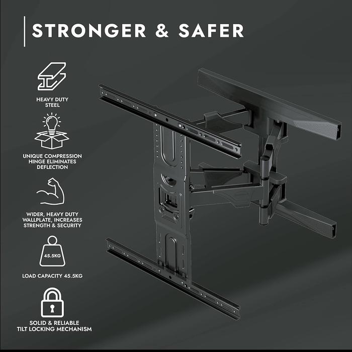 Dengan fitur Full Motion Cantilever, Anda mendapatkan kebebasan maksimal untuk menyesuaikan sudut pandang TV. Posisikan layar TV Anda dengan mudah; geser ke kiri dan kanan (swivel), miringkan ke atas dan bawah (tilt), tarik mendekati Anda, atau putar untuk sudut yang sempurna dari mana pun Anda berada.