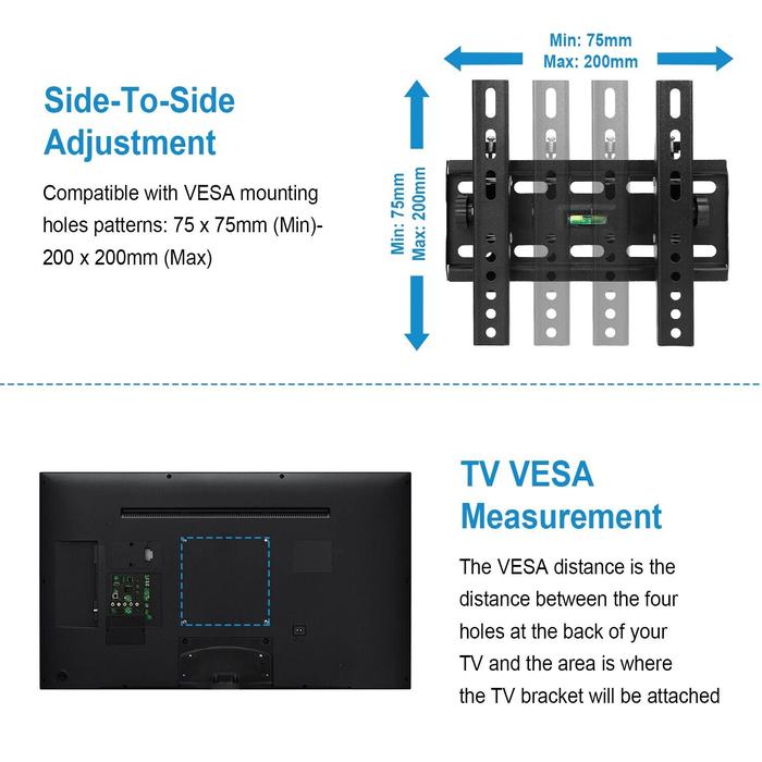 Lengkap dan siap pasang! Paket sudah termasuk waterpass untuk memastikan pemasangan yang rata, baut TV, ring, dan baut fischer berkualitas tinggi untuk berbagai jenis dinding. Mendukung standar VESA dari 5×5 cm hingga 20×20 cm.