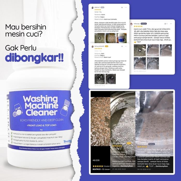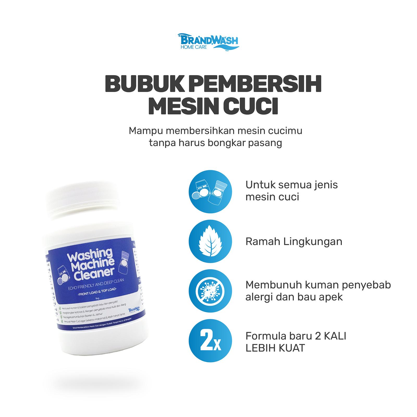 Jaga kebersihan dan performa mesin cuci Anda dengan Brandwash Pembersih Mesin Cuci. Formula khusus kami dirancang untuk mengangkat kerak membandel, sisa sabun, dan kotoran yang menumpuk di dalam tabung. Cocok untuk semua jenis mesin cuci, baik bukaan atas (Top Load) maupun bukaan depan (Front Load).
