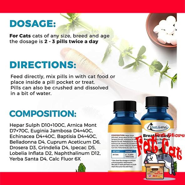 | Mengencerkan dahak & menghilangkan sumbatan di saluran napas | Kucing Kecil: 2 pil per hari |