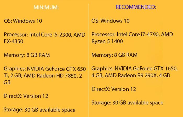 - Graphics: NVIDIA GeForce GTX 650 Ti (2GB) / AMD Radeon HD 7850 (2GB)