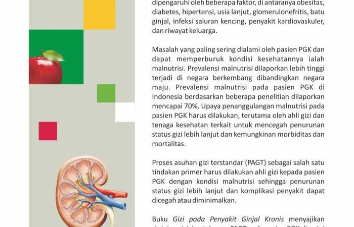 Penyakit Ginjal Kronis (PGK) adalah masalah kesehatan utama di Indonesia, dengan 83% pasien hemodialisis baru didiagnosis kondisi ini. Faktor risiko seperti diabetes, hipertensi, dan obesitas memperparah perjalanan penyakit. Tantangan terbesar yang dihadapi pasien PGK adalah malnutrisi, dengan prevalensi mencapai 70% berdasarkan penelitian di Indonesia. Kondisi malnutrisi ini sangat berbahaya karena dapat memperburuk kesehatan ginjal, meningkatkan risiko komplikasi, morbiditas, dan mortalitas.