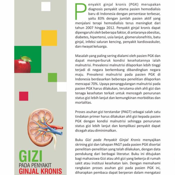 Buku ini hadir sebagai pedoman essential bagi ahli gizi, dietisien, dan mahasiswa gizi untuk melakukan intervensi yang tepat. Materi disajikan secara sistematis, mulai dari skrining gizi hingga seluruh tahapan Proses Asuhan Gizi Terstandar (PAGT) pada pasien PGK. Dilengkapi dengan data penelitian terkini dan referensi literatur yang kuat, buku ini memberikan strategi evidence-based untuk mencegah penurunan status gizi, mengoptimalkan terapi diet, dan akhirnya menekan angka komplikasi penyakit. Miliki buku ini untuk meningkatkan kompetensi profesional Anda dalam memberikan asuhan gizi yang efektif dan menyelamatkan hidup pasien.