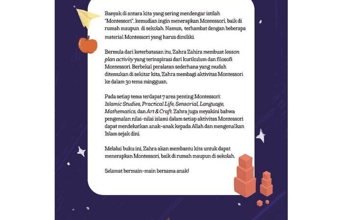 Buku panduan lengkap berisi lebih dari 200 aktivitas inspiratif untuk anak usia dini (PAUD) yang memadukan kurikulum Montessori dengan nilai-nilai Islami. Kini Anda dapat menerapkan metode Montessori dengan mudah menggunakan bahan-bahan sederhana yang ada di rumah, tanpa perlu investasi material yang mahal.