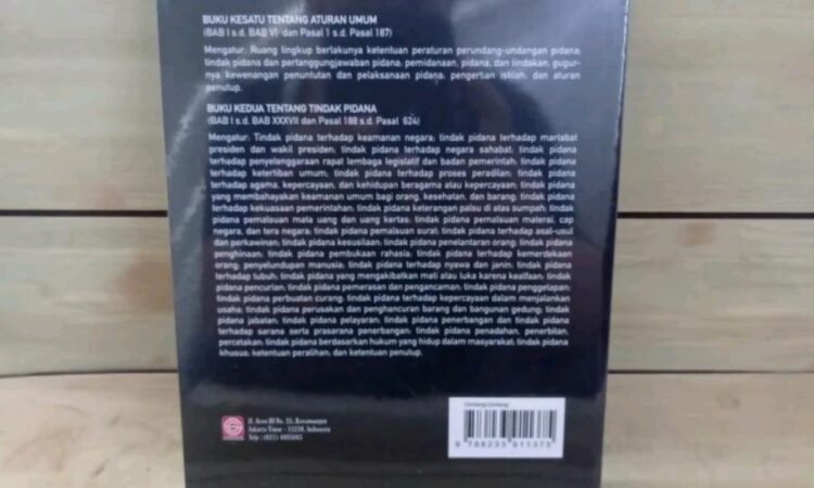 Buku KesatuMengatur aturan umum hukum pidana: ruang lingkup berlakunya hukum, tindak pidana, pertanggungjawaban pidana, pemidanaan, diversi, tujuan pemidanaan, faktor peringan/berat pidana, perbarengan, dan gugurnya kewenangan penuntutan. Termasuk pengertian istilah dan aturan penutup.
