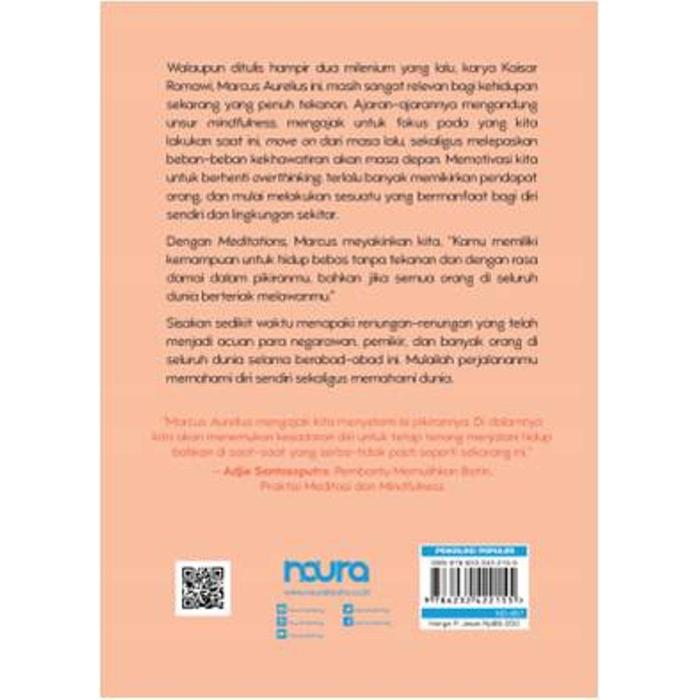 “Marcus Aurelius mengajak kita menyelami isi pikirannya. Di dalamnya kita akan menemukan kesadaran diri untuk tetap tenang menjalani hidup bahkan di saat-saat yang serba tidak pasti seperti sekarang ini.” — Adjie Santosoputro, Praktisi Meditasi dan Mindfulness