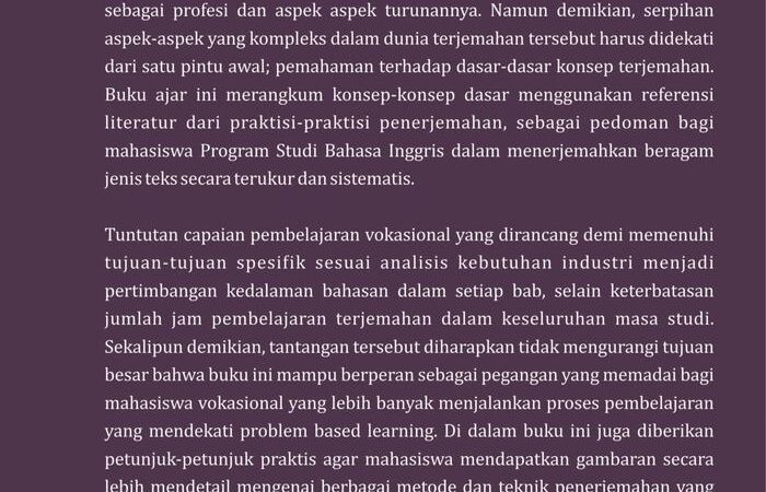 Buku ini merangkum dasar-dasar penerjemahan dari beragam literatur para praktisi, membahas kompleksitas aspek budaya, linguistik, teknikal, dan profesional. Dirancang untuk kurikulum vokasional, bahasannya disesuaikan dengan tuntutan industri dan jam belajar yang terbatas, sehingga materi padat namun mudah dicerna.