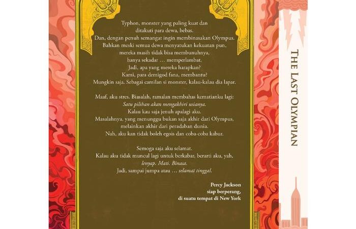 Tantangan terbesar Percy Jackson telah tiba. Typhon, monster paling mengerikan, telah terbebas dan bergerak untuk menghancurkan Olympus. Bahkan kekuatan seluruh dewa sekalipun nyaris tidak mampu menghentikannya. Kini, giliran para demigod, termasuk Percy, untuk mempertaruhkan nyawa mereka. Di tengah segala kekacauan, sebuah ramalan kuno mengisyaratkan pengorbanan yang harus dilakukan Percy. Dengan gaya khasnya yang sarkastik dan penuh humor, Percy memimpin para prajurit dalam pertempuran epik yang akan menentukan nasib dewa-dewa Olympus dan dunia manusia. Akankah ia berhasil, atau ini adalah pertarungan terakhirnya?