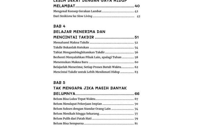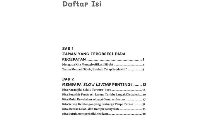 Buku ini mengupas gaya hidup slow living—sebuah filosofi untuk secara sadar melambatkan ritme hidup guna meningkatkan kualitas pengalaman dan tetap produktif. Ini adalah seni menemukan momentum yang tepat dalam setiap tindakan, sehingga hidup tidak hanya tentang mencapai tujuan, tetapi juga menikmati keseluruhan prosesnya. Bergerak lambat sama sekali bukan berarti berhenti, melainkan bergerak dengan kesadaran penuh dan sesuai irama diri sendiri.
