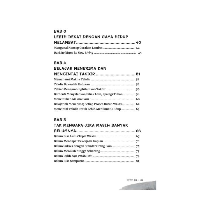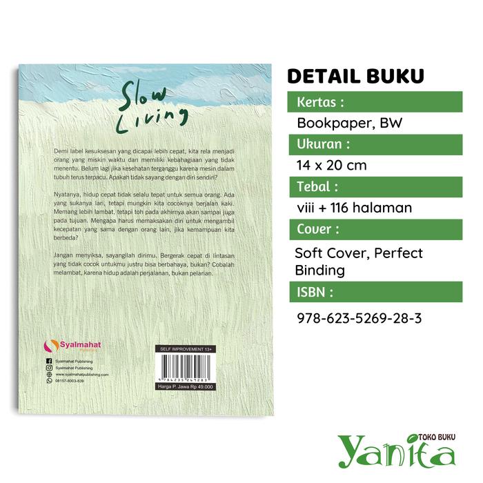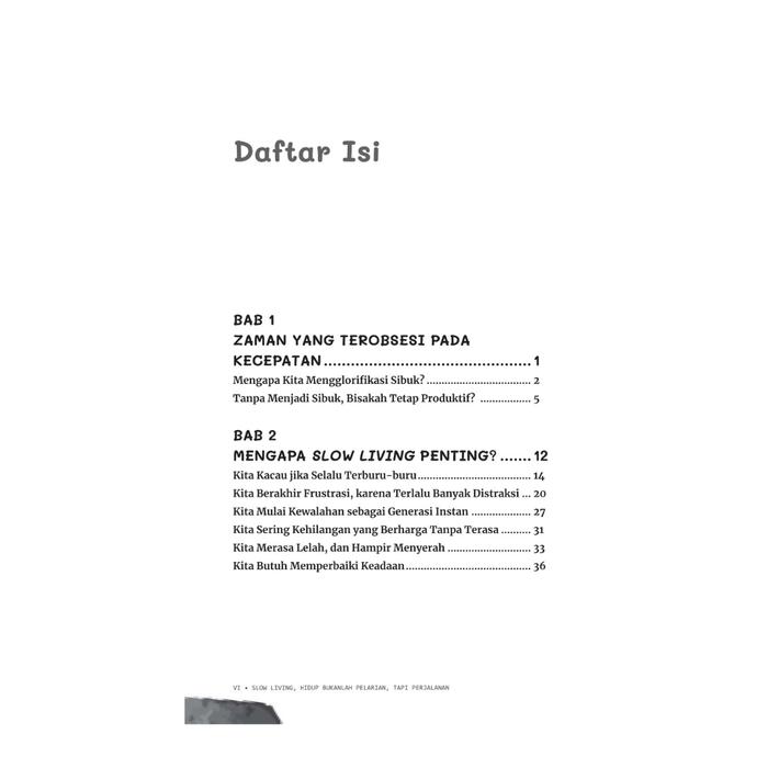 Buku ini mengupas gaya hidup slow living—sebuah filosofi untuk secara sadar melambatkan ritme hidup guna meningkatkan kualitas pengalaman dan tetap produktif. Ini adalah seni menemukan momentum yang tepat dalam setiap tindakan, sehingga hidup tidak hanya tentang mencapai tujuan, tetapi juga menikmati keseluruhan prosesnya. Bergerak lambat sama sekali bukan berarti berhenti, melainkan bergerak dengan kesadaran penuh dan sesuai irama diri sendiri.