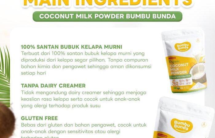 Coconut Milk Powder Bumbu Bunda adalah santan bubuk instan yang terbuat dari 100% ekstrak santan murni, diproses dengan metode pengeringan suhu rendah untuk menjaga nutrisi alami kelapa. Produk ini bebas dari bahan tambahan sintetis seperti pengawet, pewarna, perisa buatan, dan gula tambahan.