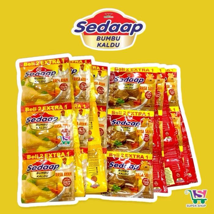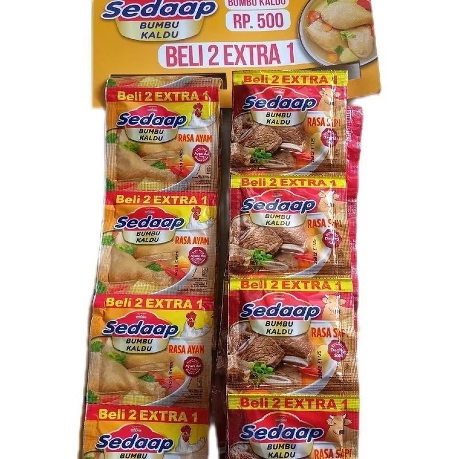 Dapatkan 1 Renteng isi 12 sachet + GRATIS 6 sachet dengan total 18 sachet dalam satu paket! Promo menarik Beli 2 Gratis 1 juga berlaku untuk pembelian lebih banyak. Bumbu Kaldu Sedaap diracik oleh chef profesional untuk mengangkat cita rasa masakan sehari-hari keluarga Anda menjadi layaknya hidangan restoran.