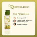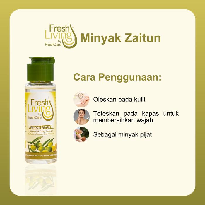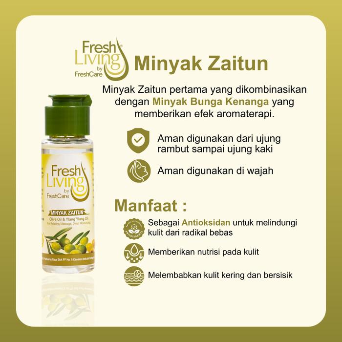 | Freshliving Zaitun Oil | 2 Botol Minyak Zaitun Aromaterapi | Antioksidan pelindung kulit, kombinasi dengan Ylang Ylang oil untuk aromaterapi. | Melembabkan kulit kering & bersisik, menutrisi kulit, serta memberikan sensasi licin yang sempurna untuk pijat. | |
