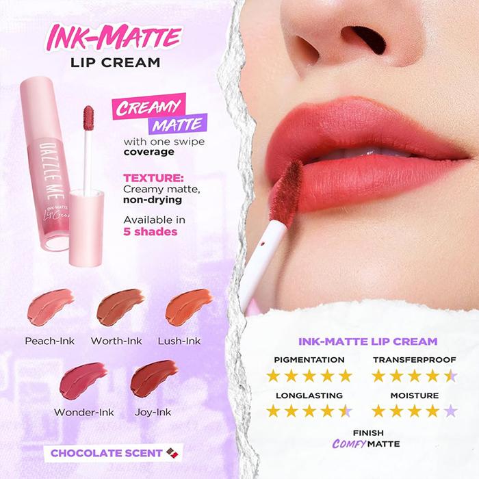 Ink-Matte Lip CreamKetahanan hingga 12 jam, hasil matte sempurna tanpa membuat bibir kering. Pigmen tinggi dengan one-swipe coverage untuk warna intens instan.Peach-Ink, Wonder-Ink, Lush-Ink, Worth-Ink, Joy-Ink