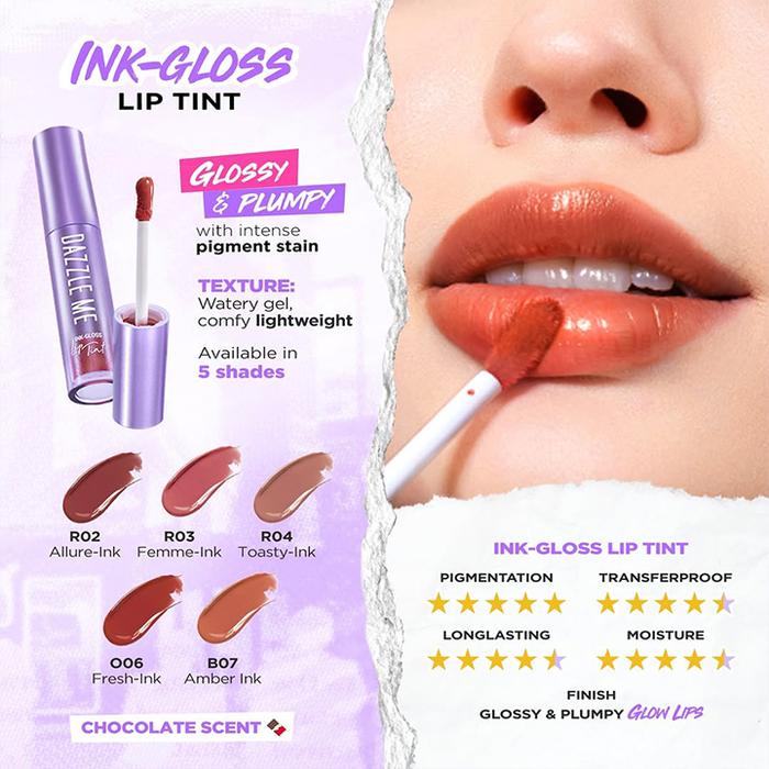 Ink-Gloss Lip TintFormulasi watery ink gel terbaru yang sangat ringan dan nyaman di bibir. Memberikan kilau maksimal dan efek plumpy yang jernih seperti kristal.Allure-Ink, Femme-Ink, Toasty-Ink, Fresh-Ink, Amber-Ink