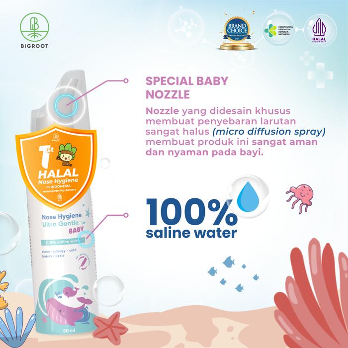 Bigroot Nose Hygiene Ultra Gentle Baby 50ml adalah pembersih rongga hidung khusus untuk bayi berusia 0-3 tahun. Dengan formula ultra lembut dan nozzle khusus, produk ini menyemprotkan larutan dalam butiran sangat halus, sehingga aman dan nyaman digunakan sehari-hari tanpa menimbulkan iritasi.