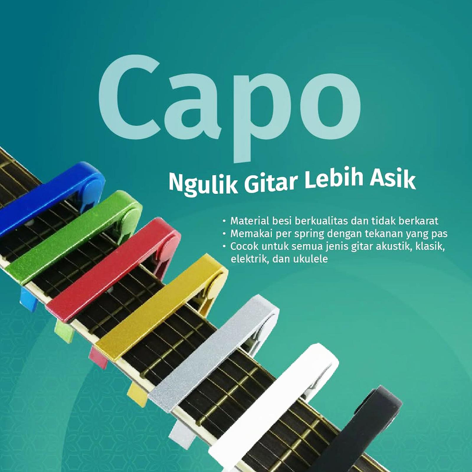 - Capo: Sebuah alat yang digunakan pada neck (leher) gitar untuk menaikkan pitch (nada) senar dengan cara menjepitnya pada fret tertentu. Fungsinya untuk memudahkan transposisi lagu tanpa mengubah kunci chord yang dimainkan.