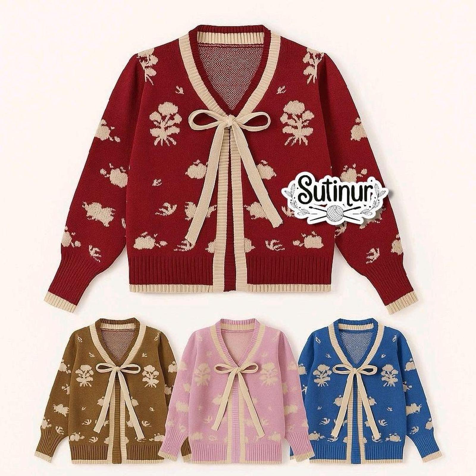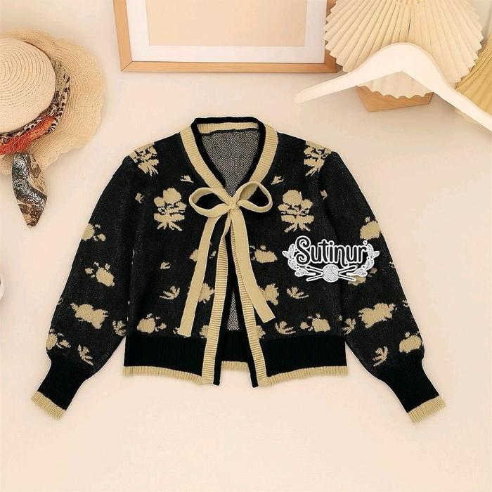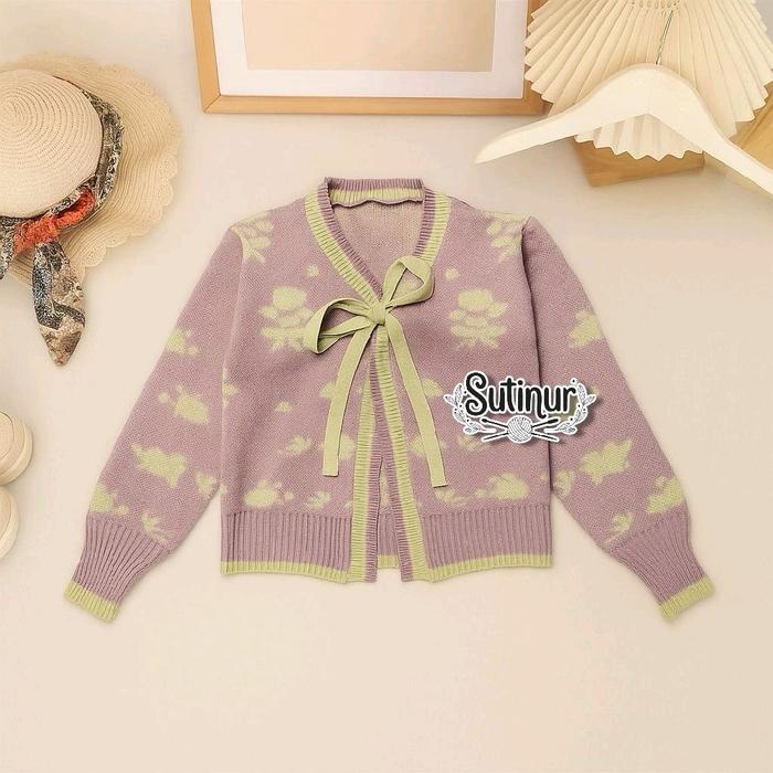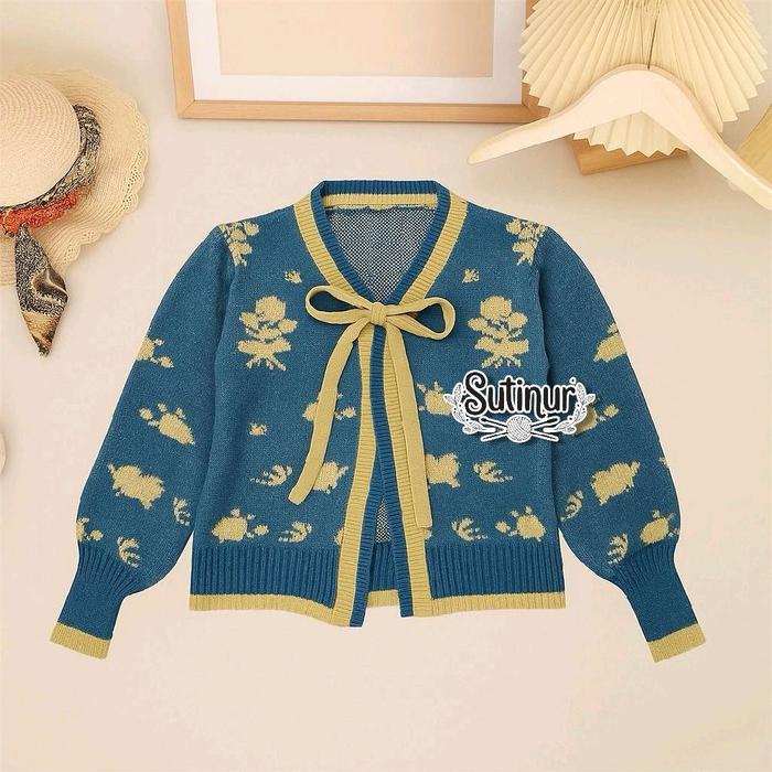 | Desain Cardigan Motif Bunga | Potongan klasik dengan jahitan rapi dan motif bunga yang cerah, menciptakan tampilan yang stylish dan bersih. |