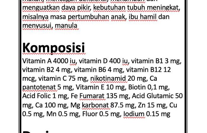 | Komposisi Lengkap | Mengandung 18 jenis vitamin dan mineral esensial untuk menjaga daya tahan dan kebugaran tubuh. |