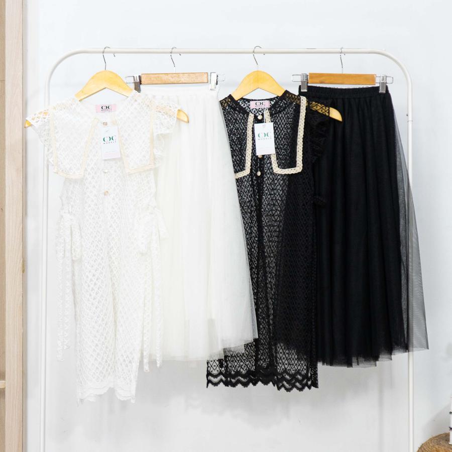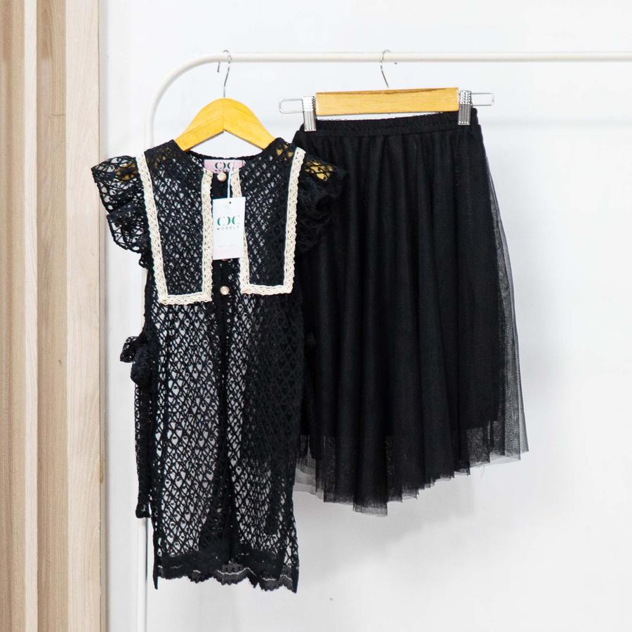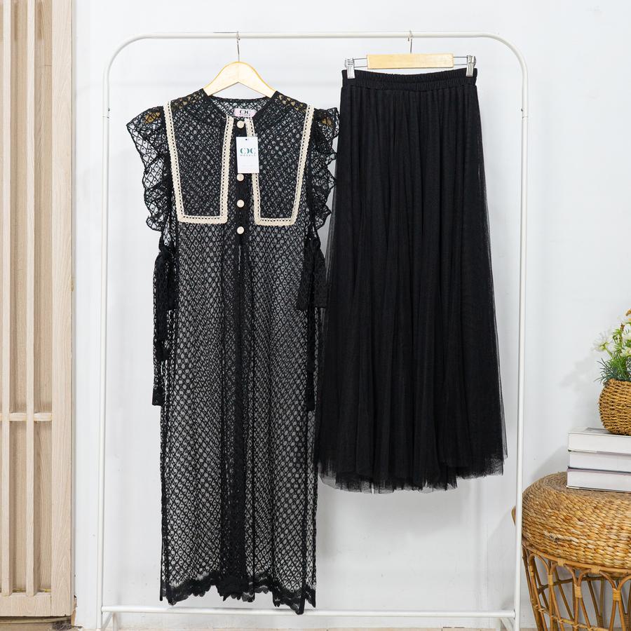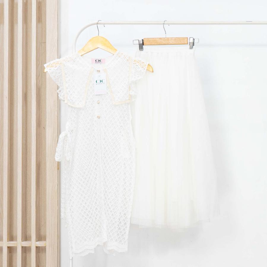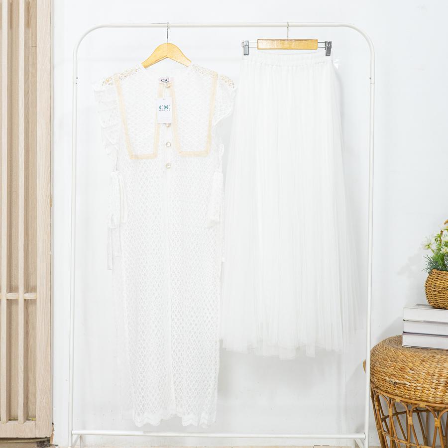 - Outer: Bagian luar (blazer/jaket) yang dipasangkan dengan rok dalam set ini.
