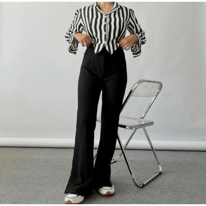 - High Waist (Tinggi Pinggang): Gaya celana dimana garis pinggangnya dipotong tinggi, biasanya hingga di atas atau tepat di pusar, untuk memberikan siluet yang lebih ramping dan panjang.