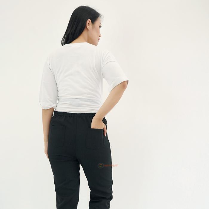 - Panel Kaos Adjustable: Bagian perut pada celana hamil yang terbuat dari bahan kaos elastis dan dilengkapi dengan karet serta kancing pengatur. Fitur ini memungkinkan celana dapat melebar secara fleksibel mengikuti pertumbuhan ukuran perut selama masa kehamilan.