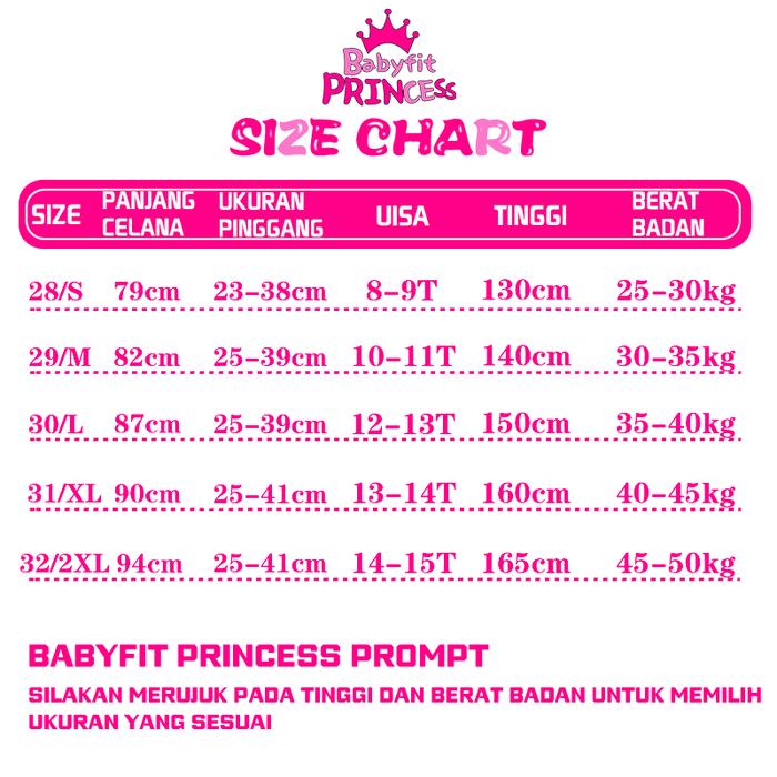 | Size | PC (cm) | UP (cm) | Tinggi (cm) | Berat Badan (kg) | Usia |